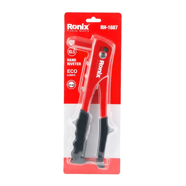 ابزار محکم و بادوام از جنس فولاد A3 و آلومینیوم با استحکام بالا؛ دارای سیستم پرچ متمایز برای پرچ سریعتر و دفع آسان اضافات؛ مجهز به دسته ارگونومیک و ضد لغزش با روکش PVCو طراحی منحصربهفرد برای سهولت کاربری و تامین نیروی کافی برای پرچ مهرههای مختلف